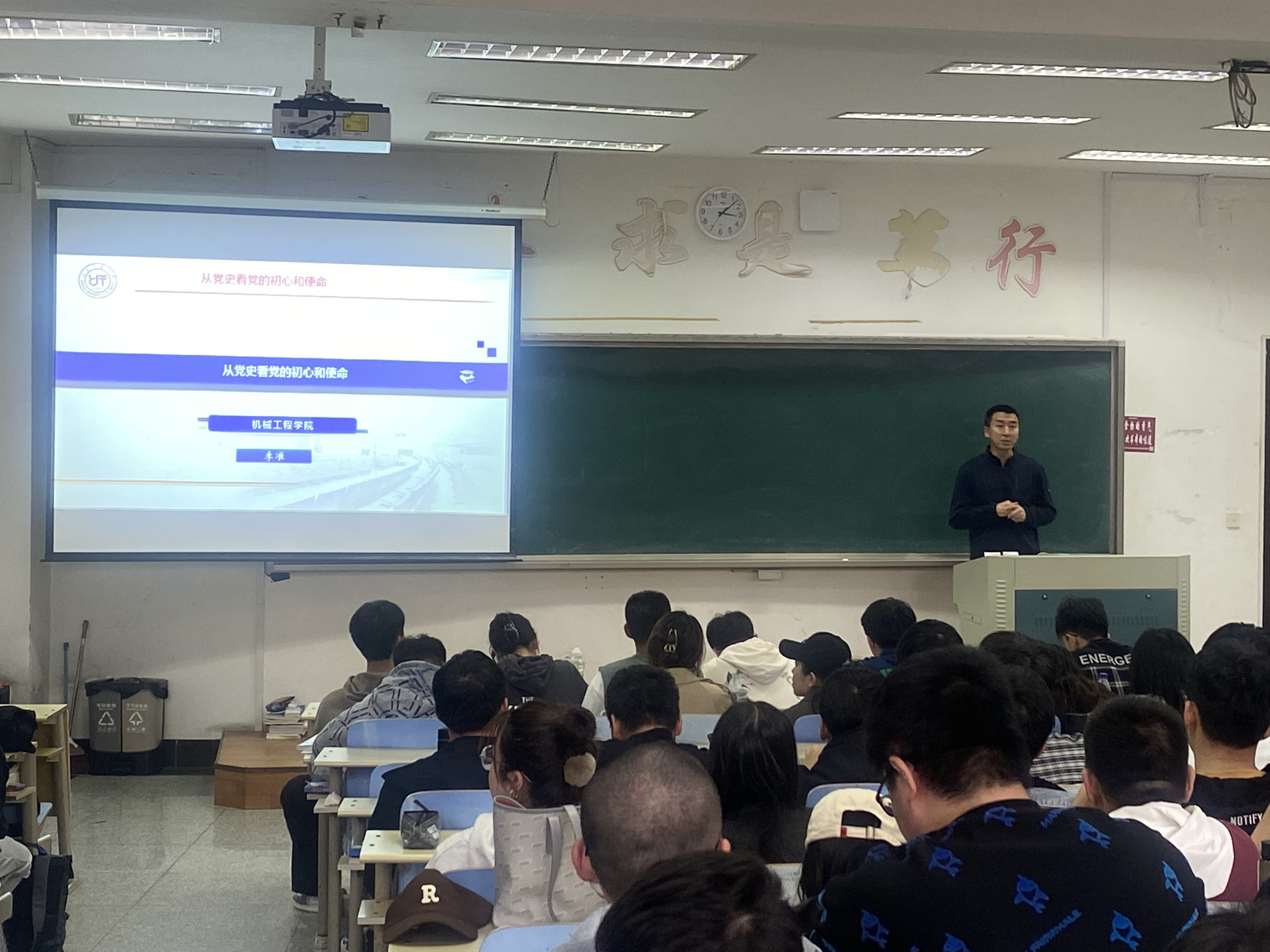 李准讲课的主题为《从党史看党的初心和使命》。他从第一篇章中国历史阶段划分讲起,包括古代史,近代史,现代史,党史和国史,从外患不断、内乱不止再到抗争不息,让同学们了解到了党的发展历程。通过党在全国解放战争时期的一些事例,说明了“没有共产党,就没有新中国”;紧接着讲述了改革与发放发展的时代,从一个春天到又一个春天,从十四大到十八大,再到十八大至今,又从大陆统一、走向世界、军事立国、外交突破等多方面展现了中国共产党的卓越贡献。第二篇章初心与使命,通过对陈独秀、毛泽东、邓小平、习近平等优秀言论的剖析,让同学们学会了如何保持自己的初心,知道了怎样做才能完成自己的使命。李准希望学员们在自己的世界里能够坚持自己的信仰——正能量的信仰。