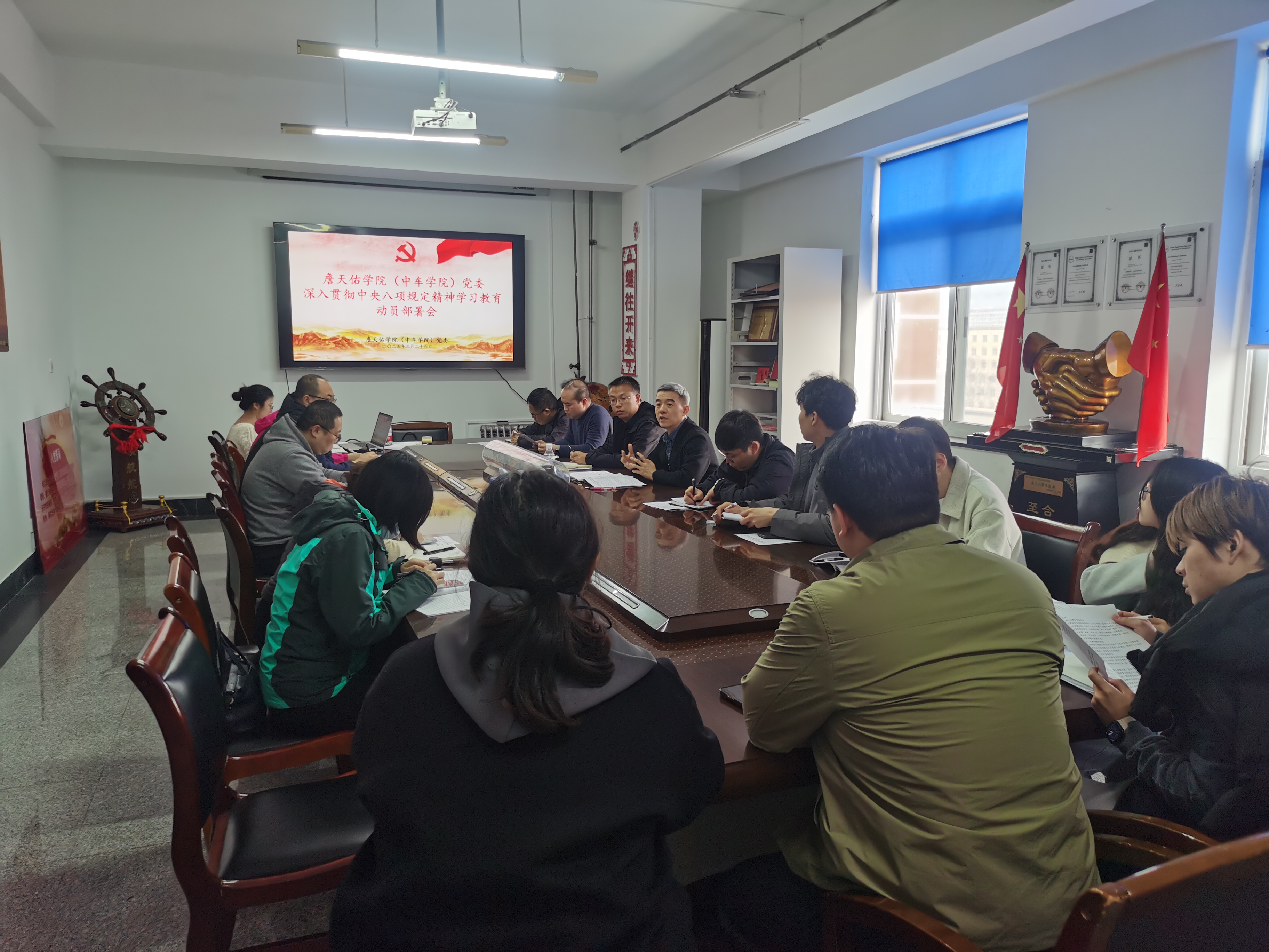 (中车学院)党委在党员活动室举行深入贯彻中央八项规定精神学习教育动员部署会,会议由党委书记郑帆帆主持,学院党委委员、班子成员、组织员和全体党支部书记参加会议。