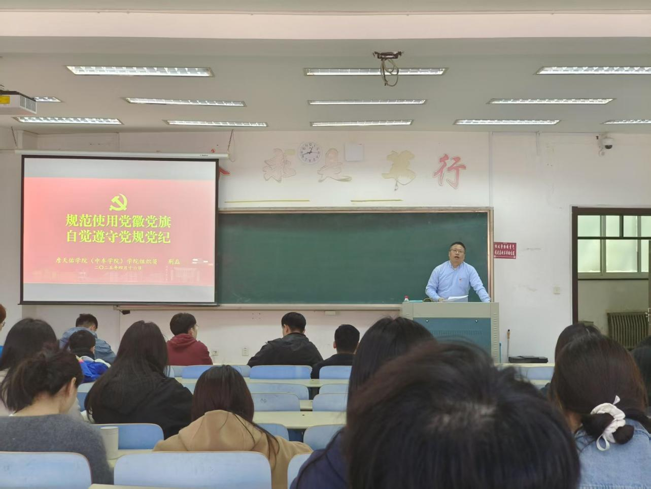 (中车学院)党委在沙河口校区S-233教室开展2025年春季学期新党员培训第二讲。由学院组织员荆磊主讲《规范使用党徽党旗自觉遵守党规党纪》,旨在强化党员对党徽党旗规范使用的认识,增强遵守党规党纪的自觉性。