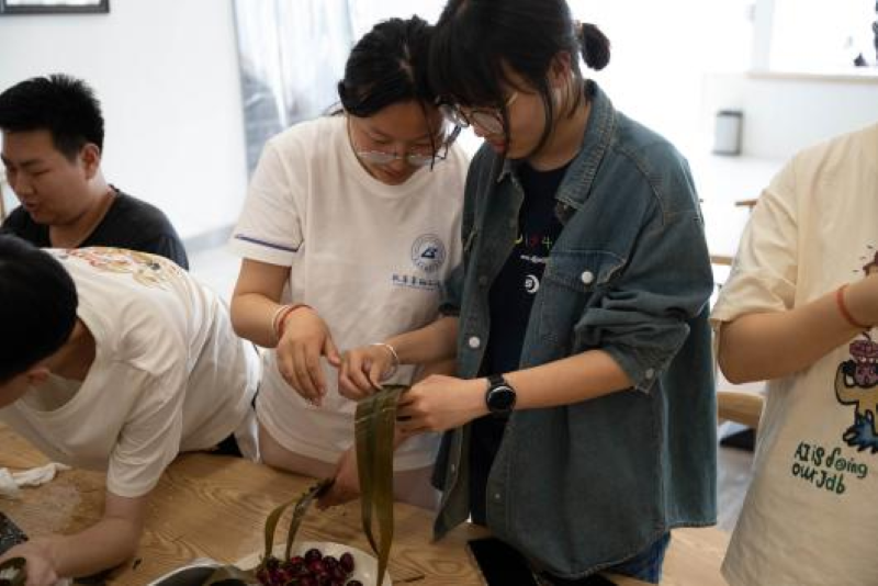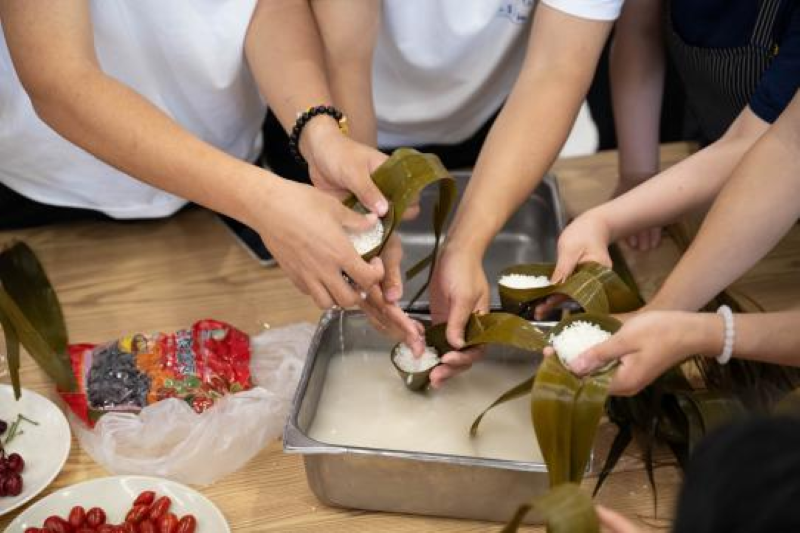 随后,同学们拿着五彩丝线缠绕、打结、编织,一气呵成,编出了各种形状和风格的漂亮五色丝线装饰,增添节日的氛围和粽子的美感。在这个过程中,大家不仅学会了如何包粽子栓丝线,也尝到了饱含师生回忆的悠悠粽香,感受到了浓浓的师生情谊。