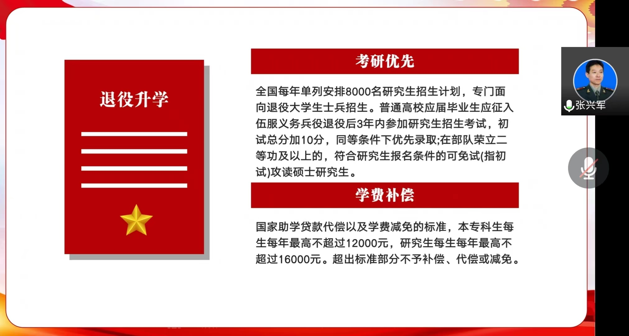 线上召开2022年毕业生征兵宣传动员专项会议,邀请到校党委武装部张兴军老师进行征兵入伍政策宣讲。学院党总支副书记、部分辅导员和暂未落实就业去向的2022届毕业生、以及部分对参军入伍感兴趣的2023届本科生参会。