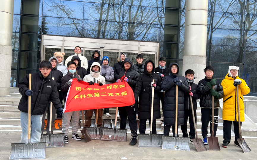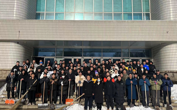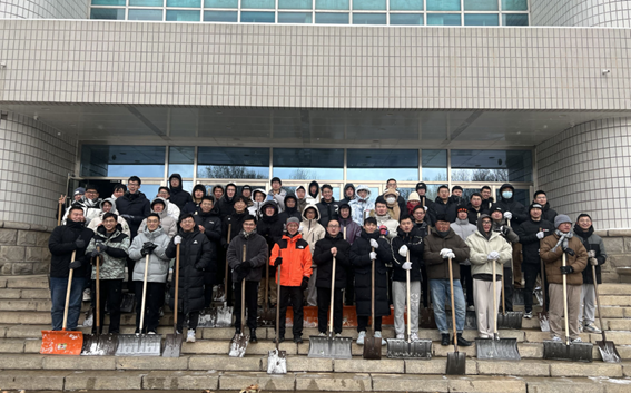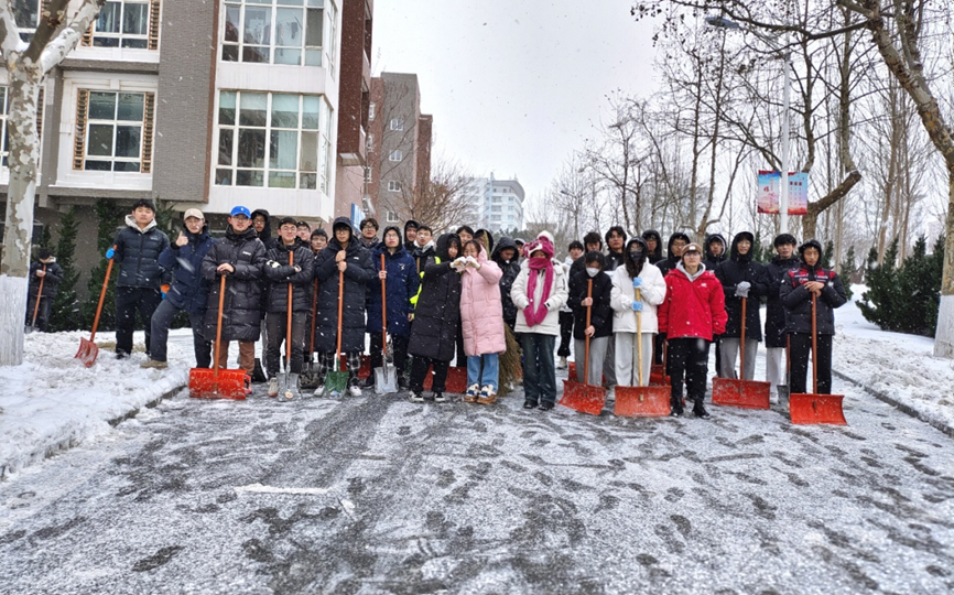 师生志愿者拿起除雪工具开展扫除冰雪活动。