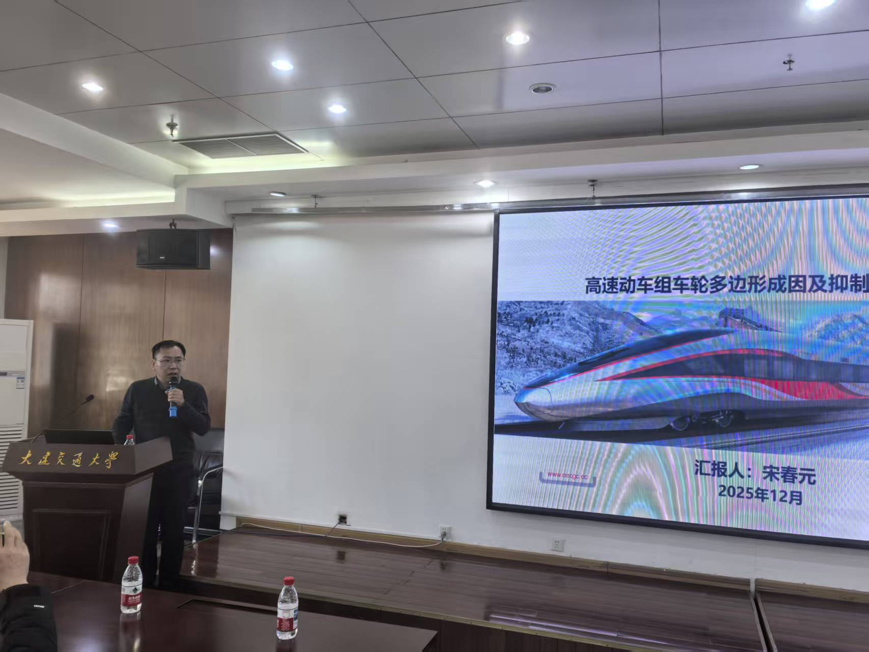 报告中,宋首席围绕高速动车组车轮多边形这一实际工程问题,系统梳理了其从发现到引发行业重视的全过程。自2010年在和谐号动车组运维中首次发现车轮多边形现象以来,该问题一度未引起足够关注,直至2015年因导致转向架螺栓松脱等安全隐患,才真正成为行业研究焦点。宋首席结合多年工程实践与理论研究成果,深入剖析了车轮多边形的影响因素,并介绍了团队在轮轨耦合振动机理方面的系列探索。通过构建磨耗仿真模型,团队进一步验证了多边形形成的内在机制,为后续工程应用提供了理论支撑。
